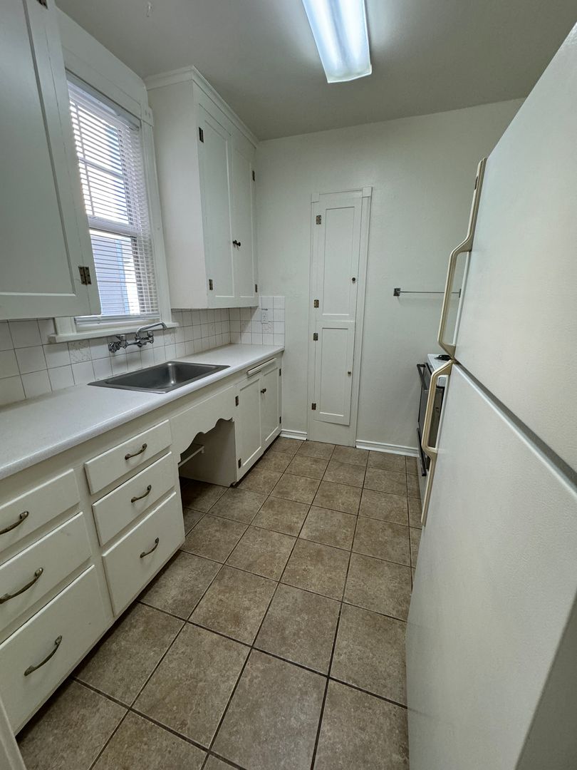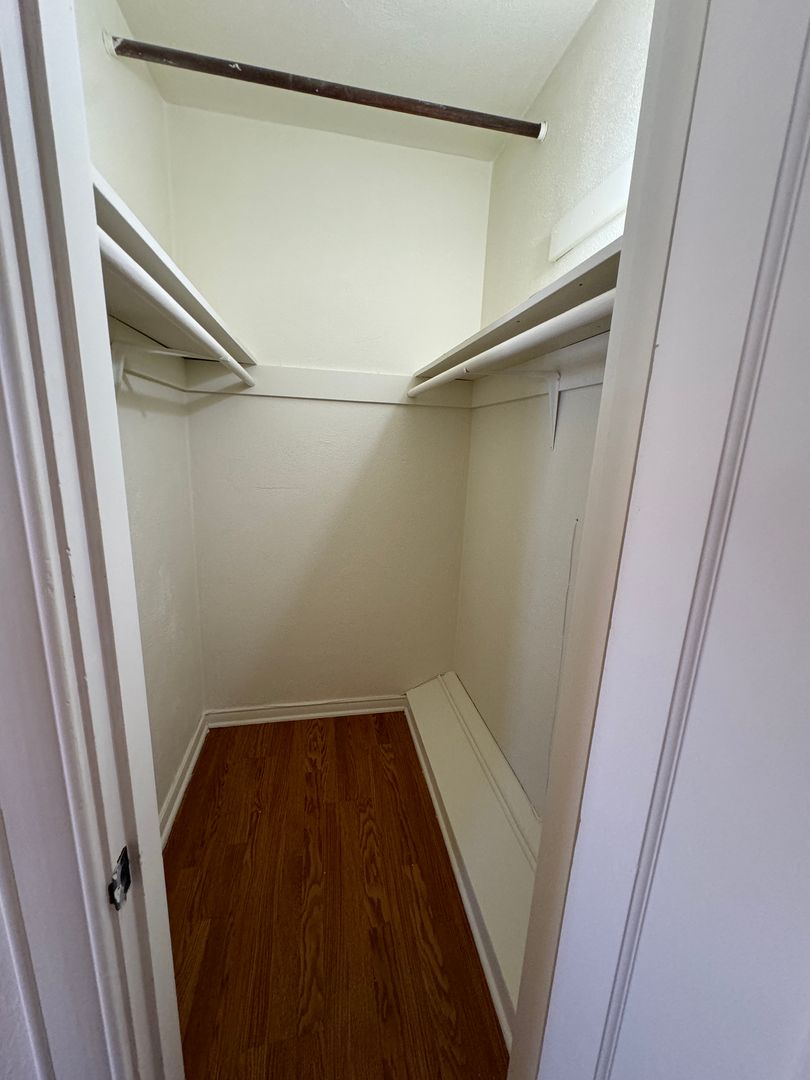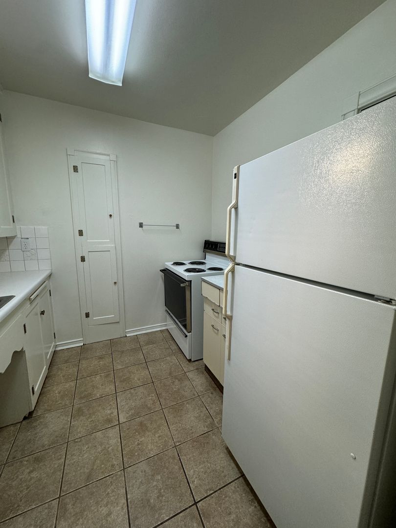 Cute 1 bedroom 1 bath ground floor apartment in a secured building vaulted ceilings. Hardwood floor throughout. Kitchen with range and fridge. Small dining area. On-site laundry in shared basement. Carport in rear of building. Close to shopping. Fireplace is inoperable.