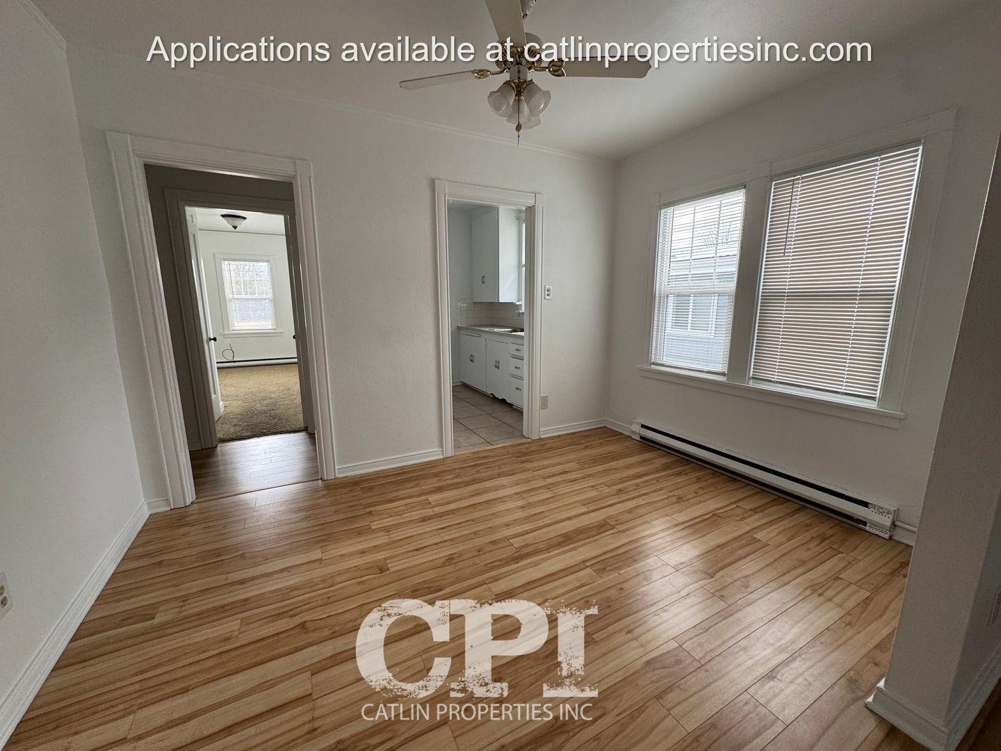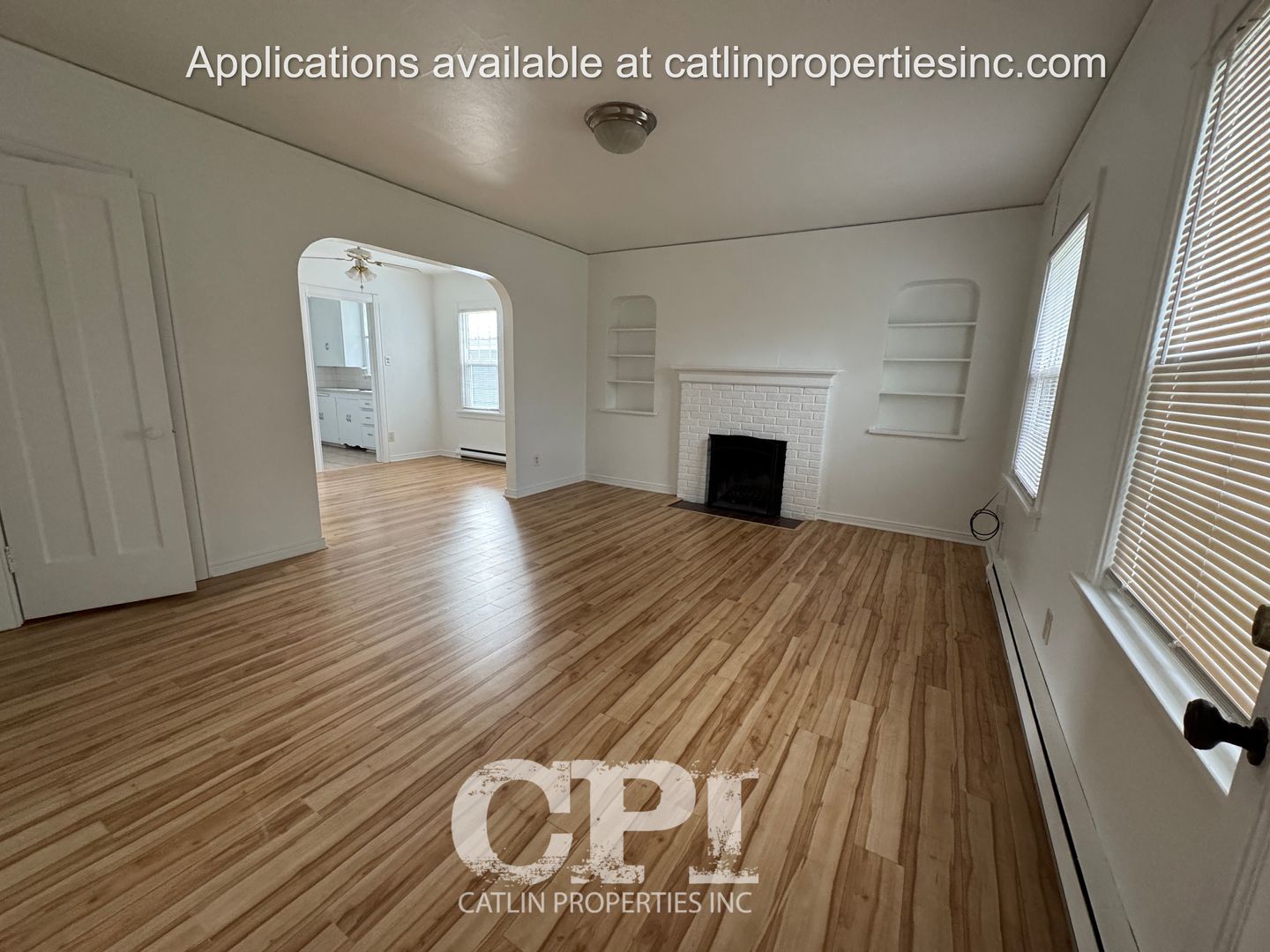The unit features hardwood floors in the main living area, while the bedroom is carpeted for added coziness. The kitchen is equipped with a fridge and stove, and the apartment also includes an inoperable fireplace and ceiling fans for added charm and comfort. The bedroom boasts two closets, providing ample storage space, and the bathroom includes a linen closet.